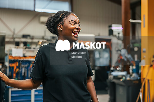 Glad kvinnlig fabriksarbetare skrattar