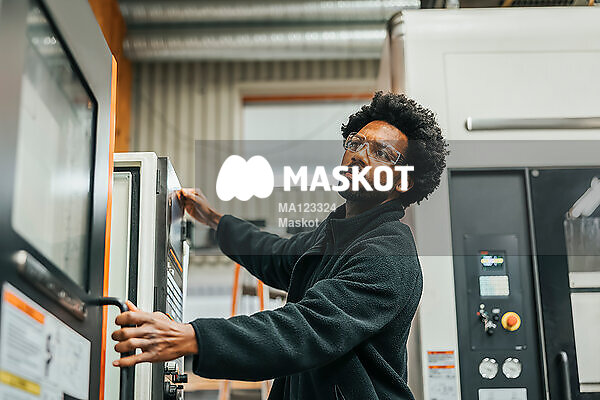 Manlig fabriksarbetare kontrollerar maskin