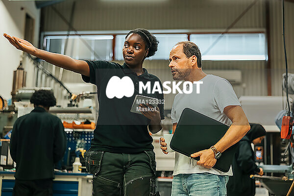 Kvinnlig fabriksarbetare visar fabrik för nyanställd