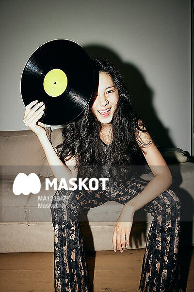 Porträtt av glad ung kvinna som håller i vinylskiva