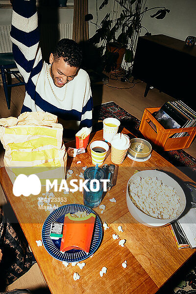 Glad ung man äter snabbmat i vardagsrum