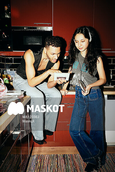 Ung man och kvinna lyssnar på cd-skiva i kök