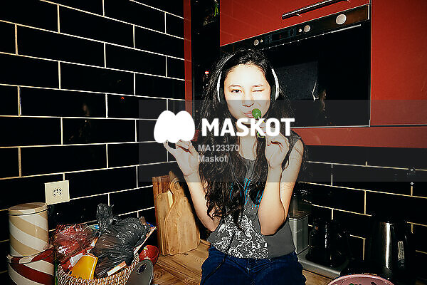 Porträtt av ung kvinna som poserar på köksbänk