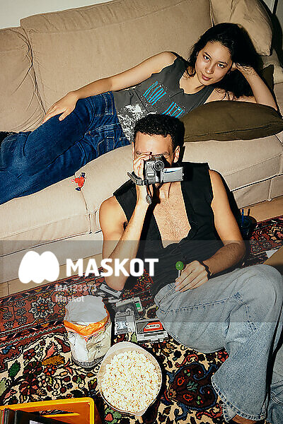 Porträtt av ung kvinna som ligger i soffa bredvid kompis