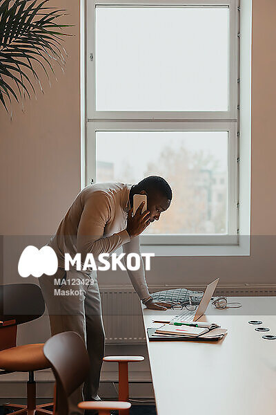 Man pratar i telefon och kollar på dator på kontor
