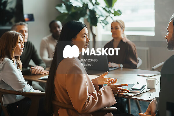 Ung kvinnlig kontorsarbetare pratar med kollega under möte