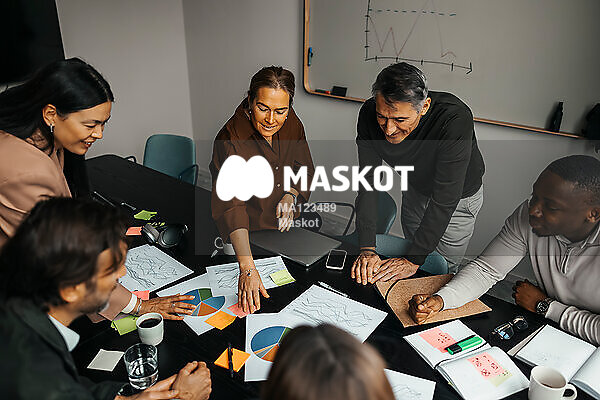 Manliga och kvinnliga kontorsarbetare diskuterar på kontor