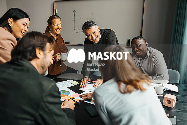Glada manliga och kvinnliga kontorsarbetare diskuterar