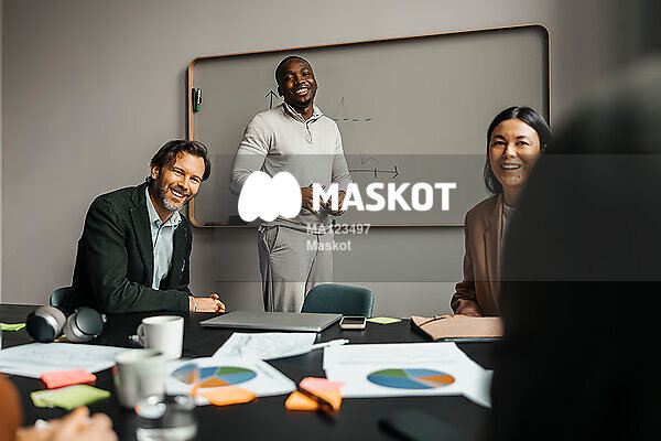 Leende manlig kontorsarbetare diskuterar med kollegor