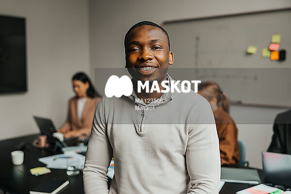 Porträtt av leende ung affärsman som sitter i mötesrum