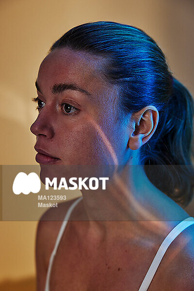 Blått ljus faller på ung kvinna med träningskläder