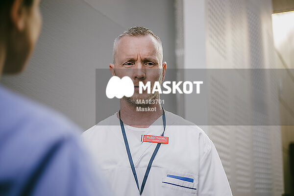 Manlig läkare pratar med kvinnlig kollega
