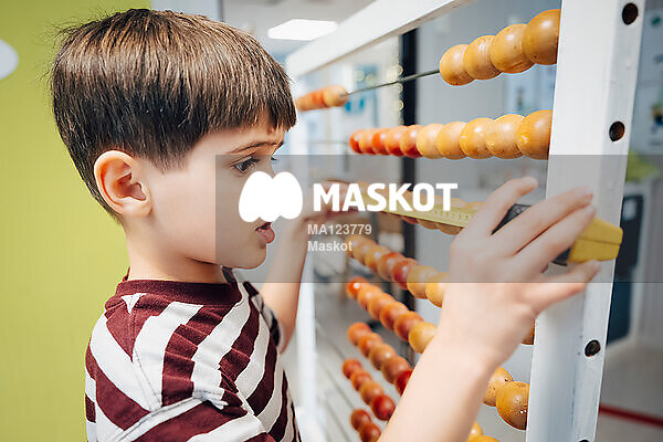 Fokuserad ung pojke mäter kulram med måttband